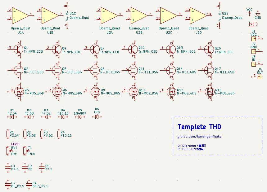 回路シンボルには、基板上でどのような形をしているかを表す「フットプリント」を割り当てる必要があります。フットプリントは形やピン間隔等いろいろな種類があり、どれを選べばよいかわかりにくいため、テンプレートではフットプリント割り当て済みのシンボルを配置しています。