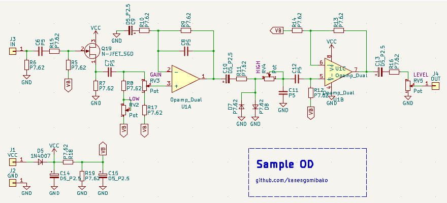 例としてオーバードライブの回路を描きました。文字の移動や回転も可能で、見た目を整えたい場合は文字の水平・垂直揃えにホットキーを割り当てておくと便利です。