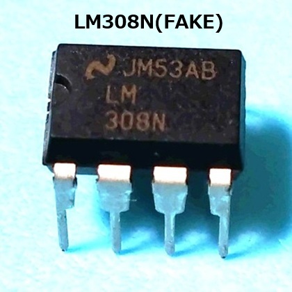 ICの表面を削り、偽のマーキングが施してあるリマーク品が出回っています。現在DIPパッケージで生産されている安価なシングルオペアンプは、UA741、TL071、OP07、NE5534があり、LM308の偽物はこれらのリマーク品である可能性が高いです。 UA741やTL071(TL061やTL081も同様)は、オフセット調整が1番ピンと5番ピンなので、このピン間の抵抗値を測定すると数k~十数kΩとなります。 同様にOP07やNE5534では、1番と8番ピン間が数k~数十kΩとなります。 これらに当てはまる場合は偽物なので、もし購入される場合は、開封から測定まで証拠動画を撮っておくとよいです。 ※ LM308の場合、テスターの種類によっては1番と8番ピン間が数MΩと出ることがあります。