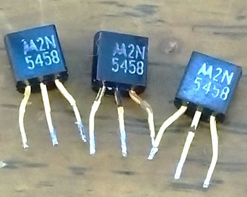 ProCo BRATから取り外したMotorola製2N5458を3個準備しました。Central製の2N5458はTaydaElectronicsで購入可能です。