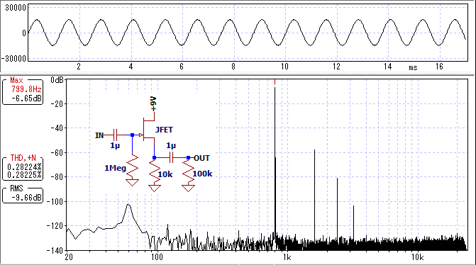 2N5458はわずかにクリッピングが発生しています。同じくらいの歪率で、入手性がよいスルーホール部品はなさそうです。歪率を気にしないのであれば、J112を使うとよいでしょう。
