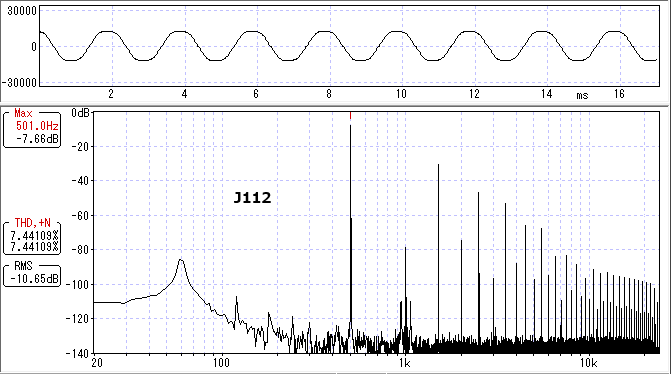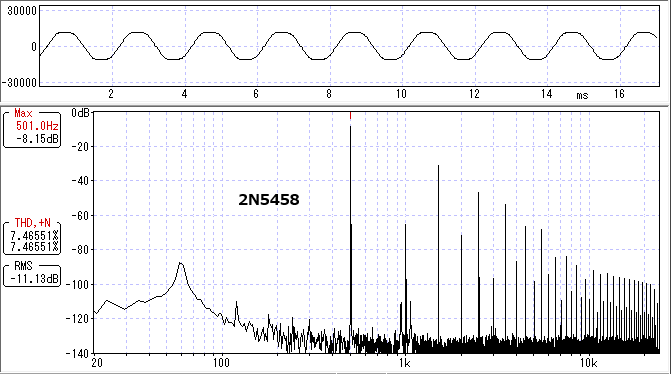 判別するのは難しいかもしれませんが、J112よりも2N5458の方が少し偶数次倍音が多いのが確認できました。