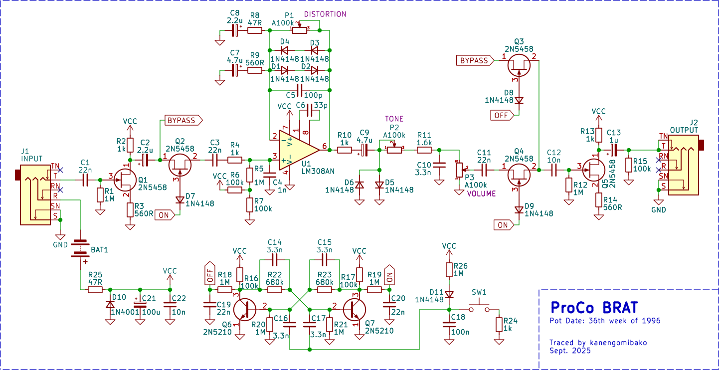 ジャンク品として手に入れたProCo BRATを修理、解析しました。 KiCadデータ(基板画像入り)とLTspiceの回路図データはGitHubにあります。 RATの歴史や回路解析については下記リンクをご参照ください。